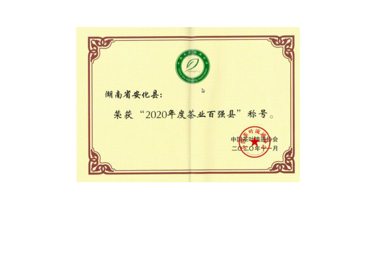 湖南省安化县荣获“2020年度中国茶业百强县”